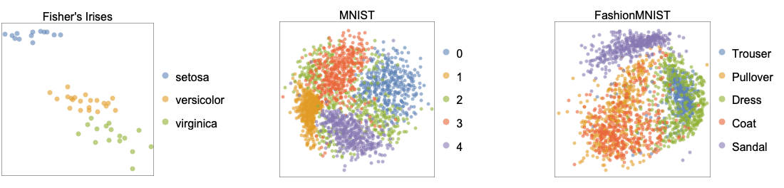 - The following plots show two-dimensional embeddings learned by the "MultidimensionalScaling" method applied to the benchmarking datasets Fisher's Irises, MNIST and FashionMNIST: