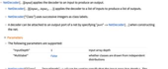 - NetDecoder[…][{input1,input2,…}] applies the decoder to a list of inputs to produce a list of outputs.
