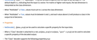 "InputDepth" 1 input array depth "Multilabel" False whether classes are drawn from independent distributions - NetDecoder[{"Class",…,"InputDepth"->n}] can be used to specify that the input array has depth n. The default depth is 1, indicating that the input is a vector. For matrix or higher-rank inputs, the last dimension is interpreted as the class dimension.