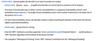 - The input to the decoder input is either a vector of probabilities or a sequence of probability vectors. Each probability vector sums to 1. The length of each probability vector is the number of elements in the token list of the parent NetEncoder.