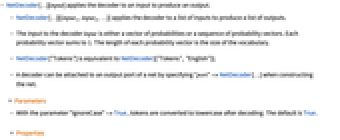 - A decoder can be attached to an output port of a net by specifying "port"->NetDecoder[…] when constructing the net.