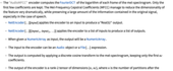 - The "AudioMFCC" encoder computes the FourierDCT of the logarithm of each frame of the mel-spectrogram. Only the first few coefficients are kept. The Mel-Frequency Cepstral Coefficients (MFCC) manage to reduce the dimensionality of the feature very dramatically, while preserving a large amount of the information contained in the original signal, especially in the case of speech.
