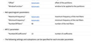 "WindowSize" Automatic length of the partitions "Offset" Automatic offset of the partitions "WindowFunction" Automatic window to be applied to the partitions - Mel-spectrogram parameters: