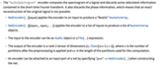 - The output of the encoder is a rank-2 tensor of dimensions {n,Floor[(ws/2.)+1]}, where n is the number of partitions after the preprocessing is applied and ws is the length of the partitions used for the computation.