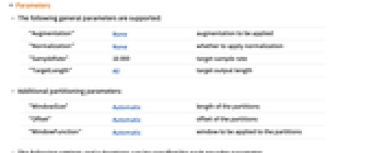 "Augmentation" None augmentation to be applied "Normalization" None whether to apply normalization "SampleRate" 16000 target sample rate "TargetLength" All target output length - Additional partitioning parameters:
