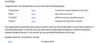 "Convolution" None convolves an impulse response to the input "Noise" None adds noise to the input "TimeShift" None shifts the input by a specified amount "Volume" None multiplies the input with a constant - Any augmentation parameter that accepts a numeric value can also be specified as a list of two numbers or a univariate distribution. In the first case, the value will be randomized according to a uniform distribution between the given bounds. In the second, the user-provided distribution will be used.