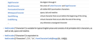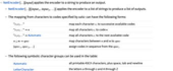Automatic all printable ASCII characters, plus space, tab and newline LetterCharacter the letters a through z and A through Z DigitCharacter the digits 0 through 9 WordCharacter the union of LetterCharacter and DigitCharacter PunctuationCharacter all visible ASCII punctuation characters WhitespaceCharacter space, tab and newline StartOfString virtual character that occurs before the beginning of the string EndOfString virtual character that occurs after the end of the string _ any otherwise unassigned character - NetEncoder["Characters"] is suitable for typical English prose and consists of all printable ASCII characters, as well as tab, space and newline.
