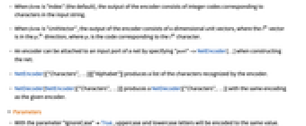 - NetEncoder["Characters"] is equivalent to NetEncoder[{"Characters",{"\t","\n",FromCharacterCode[Range[32,126]]}}].