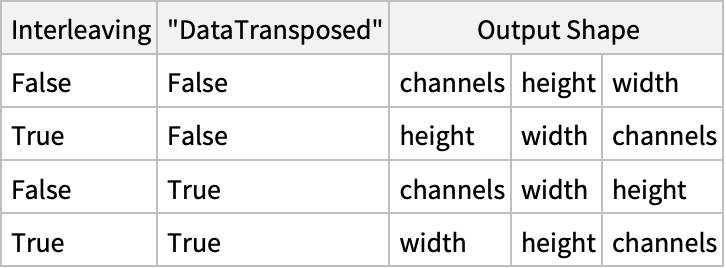 "Fill" fit the smaller dimension; crop the other if necessary - The Interleaving and "DataTransposed" options affect the output shape in the following way: