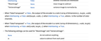 ColorSpace "RGB" color space to use for encoding "DataTransposed" False whether width is the first dimension Interleaving False whether channels are interleaved "MeanImage" None mean image to subtract "VarianceImage" None variance image to normalize by Method "Stretch" how to conform the size Resampling Automatic resampling method Alignment Center how to align the image for Method"Fit" or "Fill" Padding Black padding scheme for Method"Fit" - Possible values for Method are: