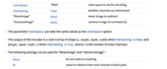 ColorSpace "RGB" color space to use for encoding Interleaving False whether channels are interleaved "MeanImage" None mean image to subtract "VarianceImage" None variance image to normalize by Method "Stretch" how to conform the size Resampling Automatic resampling method Alignment Center how to align the image for Method"Fit" or "Fill" Padding Black padding scheme for Method"Fit" - Possible values for Method are:
