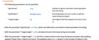 the string pattern to use in order to split the input string into tokens "TargetLength" All the length of the final sequence to crop or pad to - With the parameter "IgnoreCase"->True, tokens are effectively converted to lowercase before encoding.