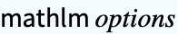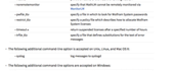 -foreground keep MathLM in the foreground and print server messages to stdout -help print the list of all command-line options and the MathID -language lang specify the language in which to display server messages -localtime use local time instead of GMT in server messages -logfile file write server messages to a specified log file -logformat string specify the format for displaying server messages -loglevel n specify the level of verbosity of server messages -mathid print the MathID of the machine running MathLM -noremotemonitor specify that MathLM cannot be remotely monitored via MonitorLM -pwfile file specify a file in which to look for Wolfram System passwords -restrict file specify a policy file which describes how to allocate Wolfram System licenses -timeout n return suspended licenses after a specified number of hours -trfile file specify a file that defines substitutions for the text of error messages - The following additional command-line option is accepted on Unix, Linux, and Mac OS X: