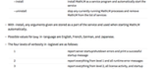 -install install MathLM as a service program and automatically start the service -uninstall stop any currently running MathLM processes and remove MathLM from the list of services - With -install, any arguments given are stored as a part of the service and used when starting MathLM automatically.