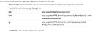 text send output in text format to stdouthtml send output in HTML format to a temporary file and launch a web browser to display the file cgi send output in HTML format to stdout(used when called directly from a web browser)