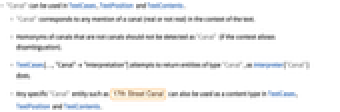 - Homonyms of canals that are not canals should not be detected as "Canal" (if the context allows disambiguation).