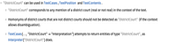 - TextCases[…,"DistrictCourt""Interpretation"] attempts to return entities of type "DistrictCourt", as Interpreter["DistrictCourt"] does.