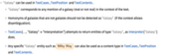 - Homonyms of galaxies that are not galaxies should not be detected as "Galaxy" (if the context allows disambiguation).