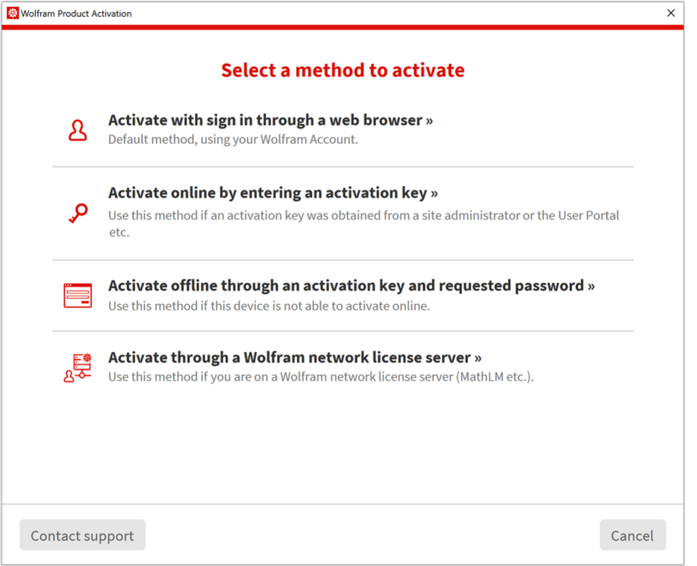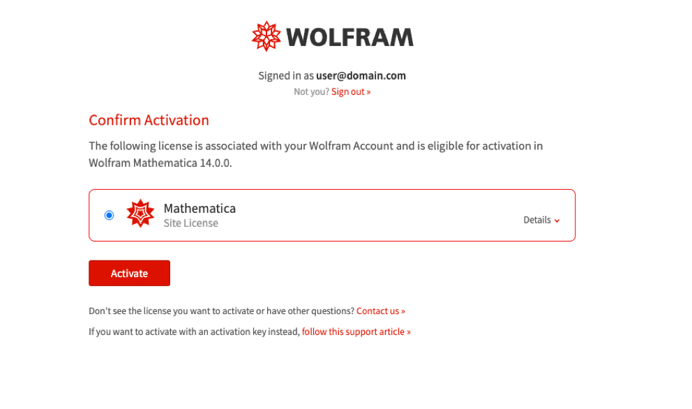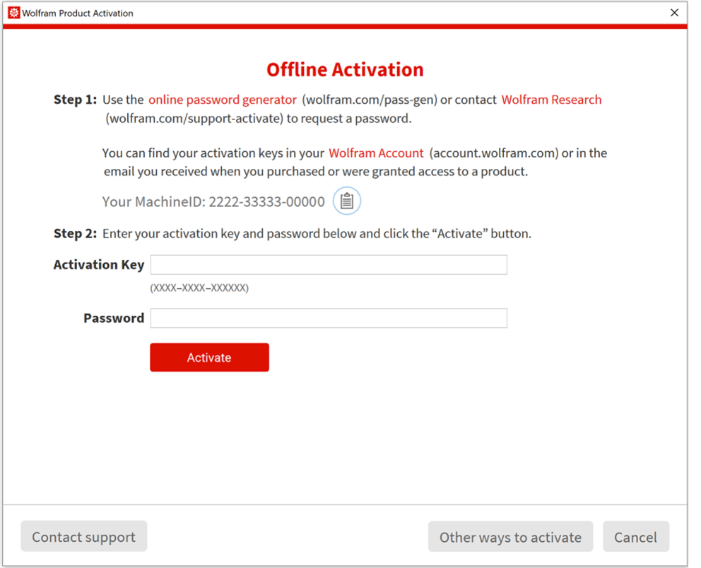 If you are unable to manually activate your Wolfram product, contact Wolfram Support with your activation key, MachineID and the password generated in the step above.