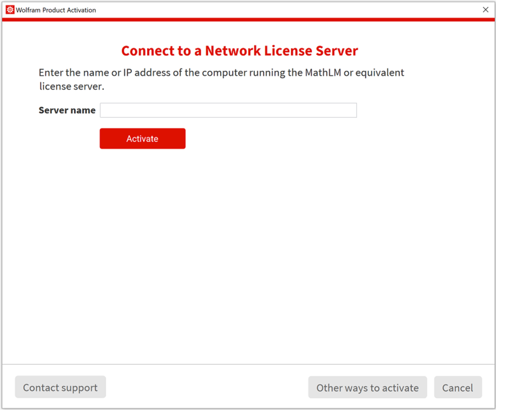 If your license is obtained from a Wolfram network license server, such as MathLM, use this method for activation. MathLM or a similar service must be installed on the license server and activated before client machines with Wolfram products can be activated. Please see "Installing MathLM" for more information.