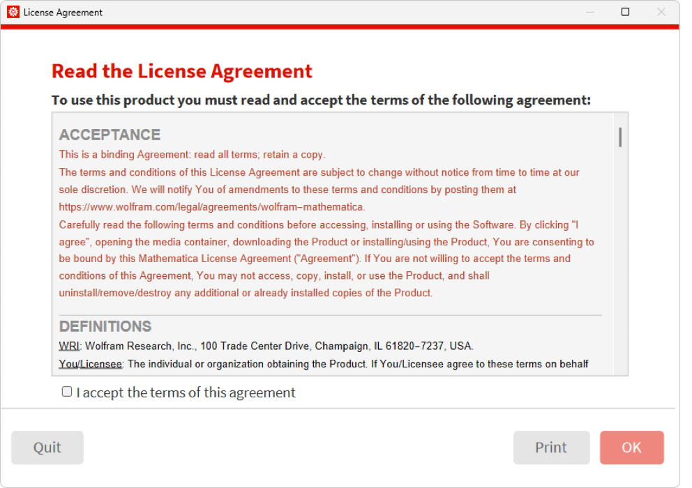 Return to the Activation Dialog in your Wolfram product. The Wolfram License Agreement window appears.