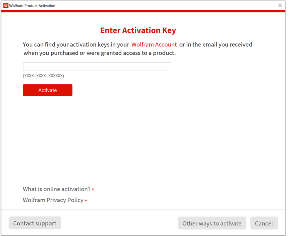 If you have your activation key, enter it and click the Activate button. Your Wolfram product will then automatically generate a MachineID and retrieve a password online through a web service.