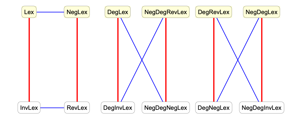 This diagram illustrates the relations between various orderings. Red lines indicate reversing the list of variables and blue lines indicate negating the power vectors.