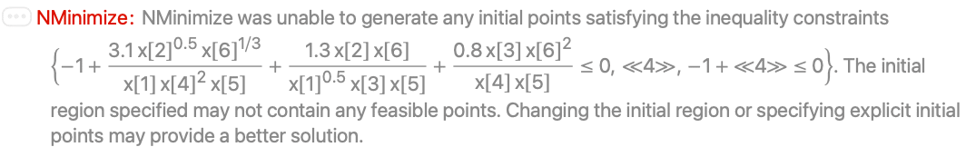 However, if efficiency is important, FindMinimum can be used if you just need a local minimum, or you can provide a good starting point, or you know the problem has only one minimum (e.g., convex), or your problem is large/expensive. This uses FindMinimum and NMinimize to solve the same problem with seven variables. The constraints are relatively expensive to compute. Clearly FindMinimum in this case is much faster than NMinimize.