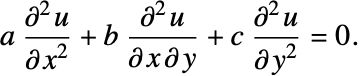 The first three terms containing the second derivatives are called the principal part of the PDE. They determine the nature of the general solution to the equation. In fact, the coefficients of the principal part can be used to classify the PDE as follows.