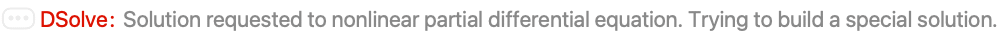 Often a coordinate transformation can be used to cast a given PDE into one of the previous types. The expression for the complete integral will then have the same form as for the standard types. Here are some examples of nonlinear PDEs for which DSolve applies a coordinate transformation to find the complete integral.