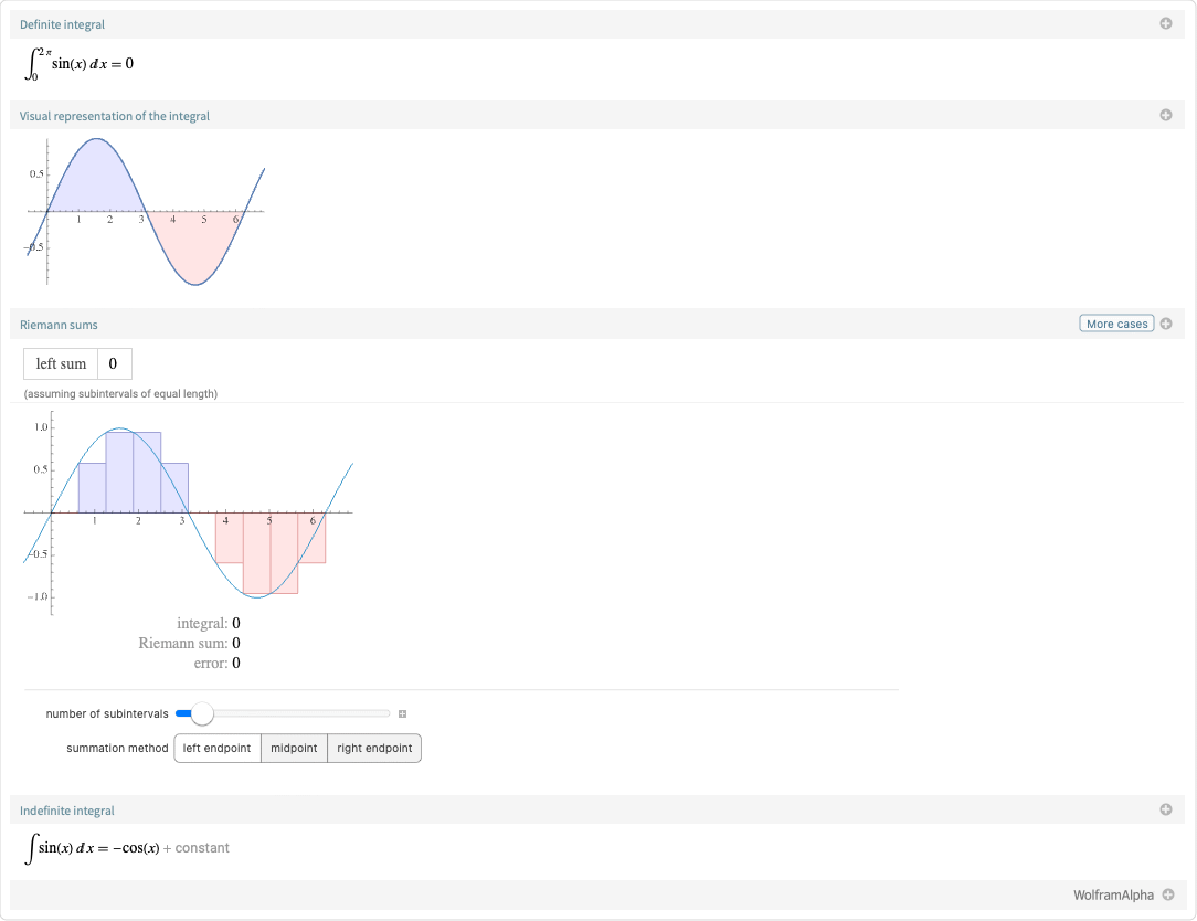 The first thing to notice is that the Integrate expression generated directly below the free-form expression is nothing other than the Wolfram Language input expression seen in the first example. This is precisely how the free-form input mechanism works: it searches for Wolfram Language input and output expressions in the results from Wolfram|Alpha and evaluates those expressions locally.