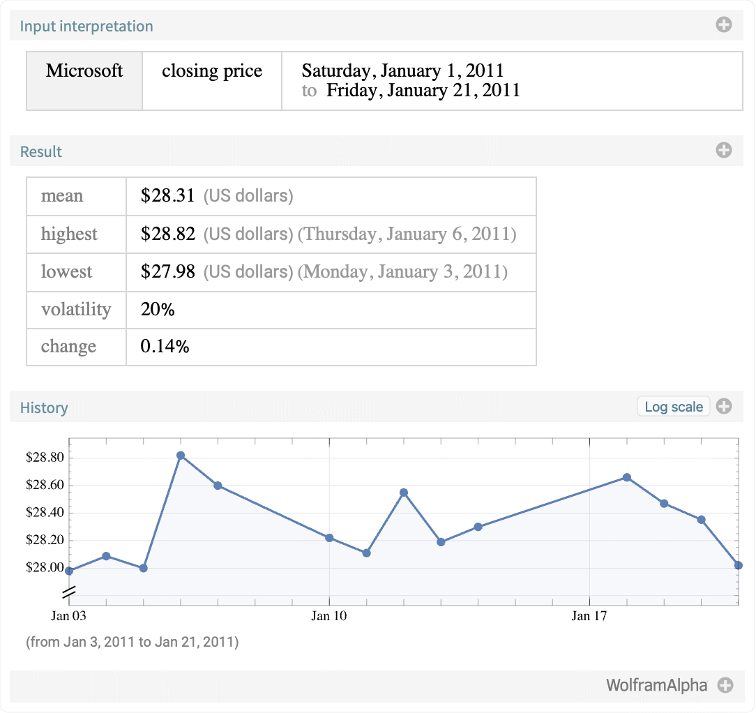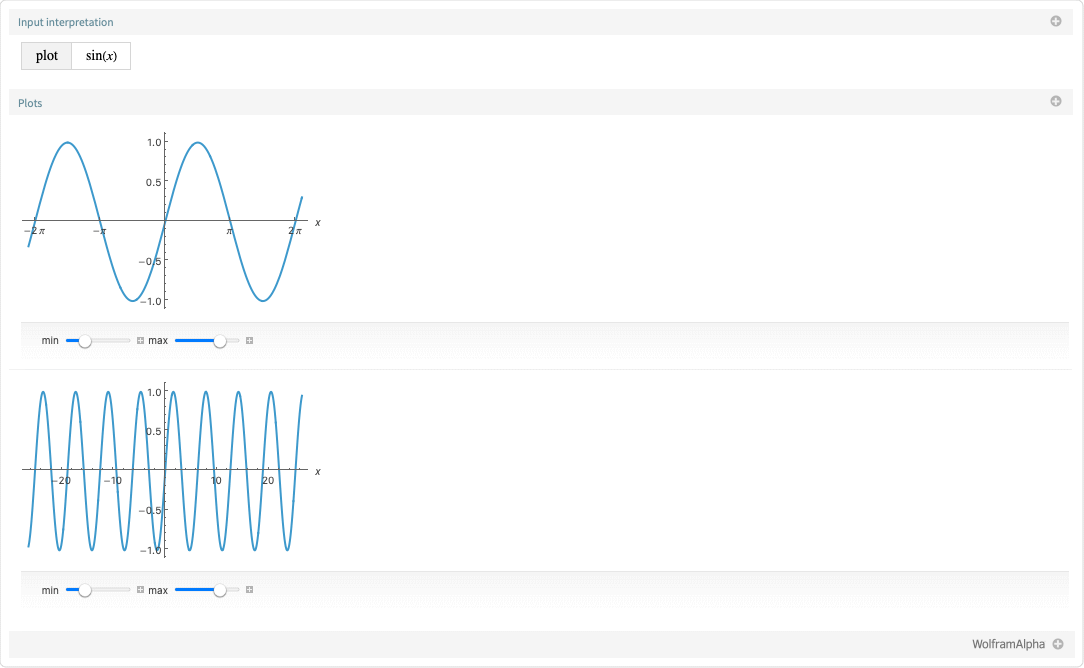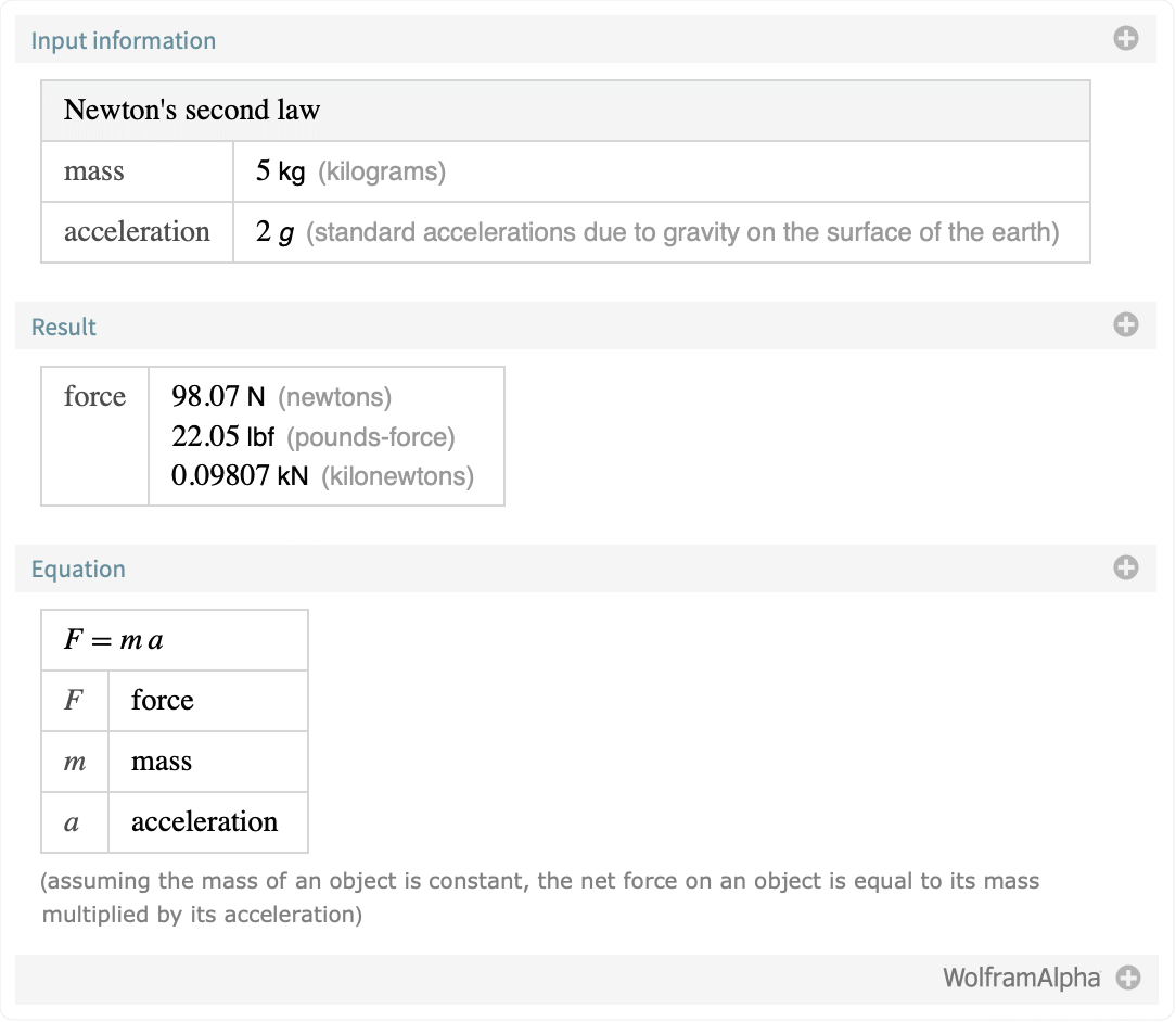 Clicking the plus sign to the right of the free-form expression reveals all the results. The Wolfram Language input expressions, if any, for each result are displayed directly above the result in a gray box. This is done precisely because the Wolfram Language input format plays such a central role in the free-form input mechanism.