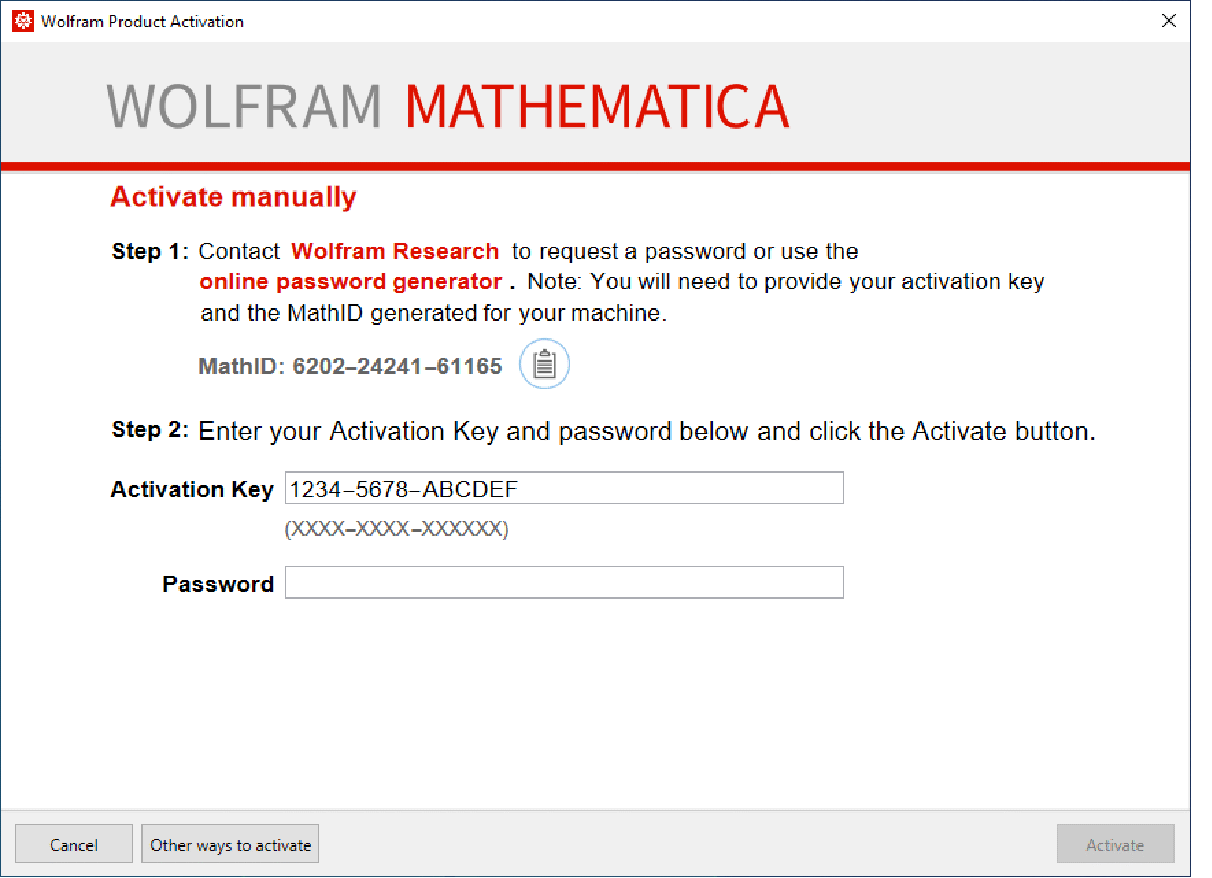3. The following dialog box appears showing the MathID number for your machine. You can find your activation key and generate your password in your Wolfram User Portal account.