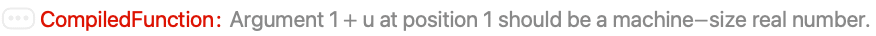 The compiled code generated by Compile must make assumptions not only about the types of arguments you will supply, but also about the types of all objects that arise during the execution of the code. Sometimes these types depend on the actual values of the arguments you specify. Thus, for example, Sqrt[x] yields a real number result for real x if x is not negative, but yields a complex number if x is negative.
