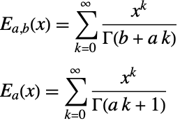The MittagLefflerE function is the natural generalization of the exponential function: just as any ODE with constant coefficients is solved in exponential functions, so also any FDE with constant coefficients is solved in MittagLefflerE functions. Here are the definitions of ordinary and generalized MittagLefflerE functions: