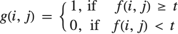 Image binarization is the operation of converting a multilevel image into a binary image. In a binary image, each pixel value is represented by a single binary digit. In its simplest form, binarization, also called thresholding, is a point-based operation that assigns the value of 0 or 1 to each pixel of an image based on a comparison with some global threshold value t.