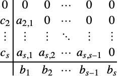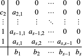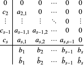 using a Butcher table, which has the following form for explicit Runge–Kutta methods.