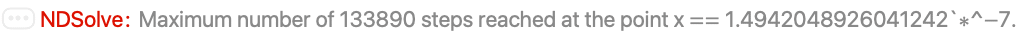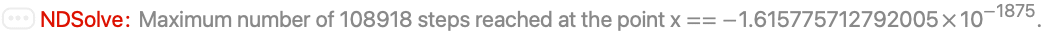 NDSolve follows the general procedure of reducing step size until it tracks solutions accurately. There is a problem, however, when the true solution has a singularity. In this case, NDSolve might go on reducing the step size forever, and never terminate. To avoid this problem, the option MaxSteps specifies the maximum number of steps that NDSolve will ever take in attempting to find a solution. For ordinary differential equations, the default setting is MaxSteps->10000.