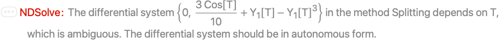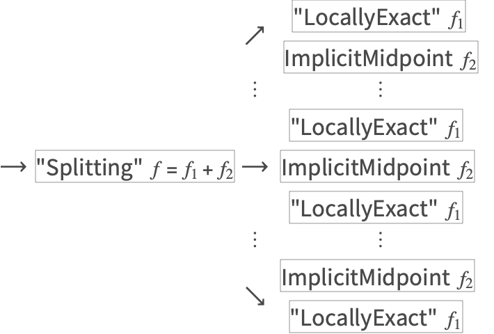 In some cases it is useful to split the differential system into subsystems and solve each subsystem using appropriate integration methods. Recombining the individual solutions often allows certain dynamical properties, such as volume, to be conserved. More information on splitting and composition can be found in [MQ02, HLW02], and specific aspects related to NDSolve are discussed in [SS05, SS06].