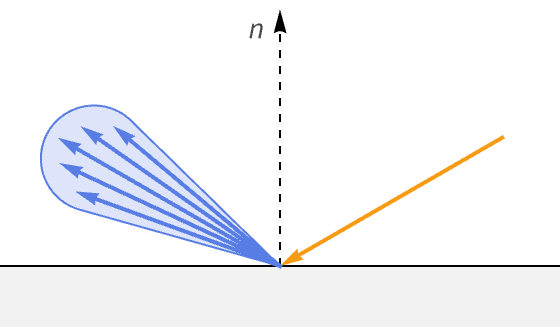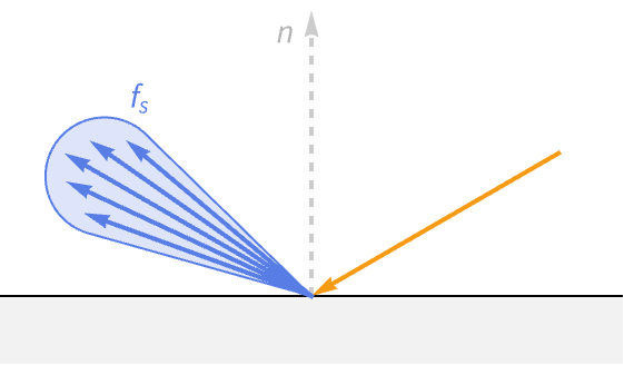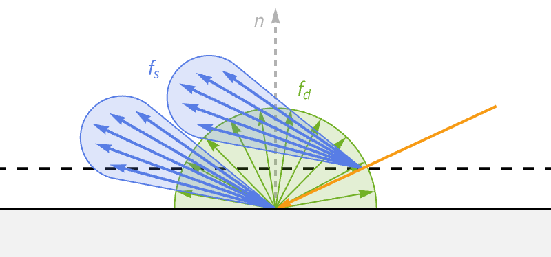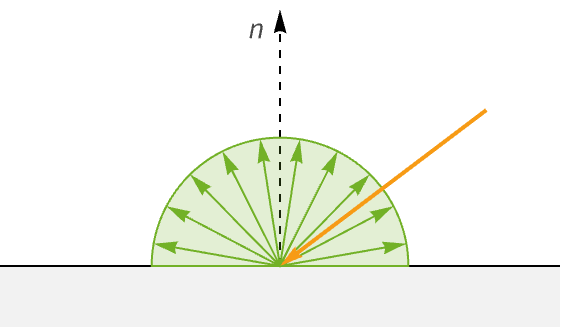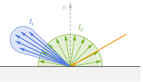 The final term for reflected light is the bidirectional reflectance distribution function (BRDF). The BRDF determines the ratio of incident light at the surface point that gets redirected in the outgoing direction. In contrast to the previous terms, this function is unique to different material types.