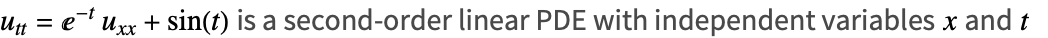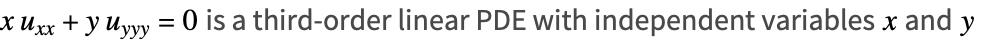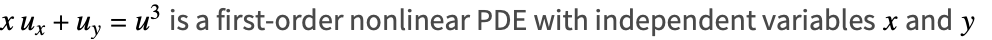 4. Linearity. Partial differential equations could be either linear or nonlinear. If the dependent variable u and all its partial derivatives occur linearly in the PDE, then the PDE is linear. More precisely, a second-order linear PDE in two independent variables is an equation of the form