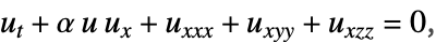 The Kadomtsev–Petviashvili (KP) equation is a nonlinear partial differential equation in two spatial coordinates and one temporal coordinate modeling the evolution of nonlinear long waves of small amplitude with slow dependence on the transverse coordinate [211]: