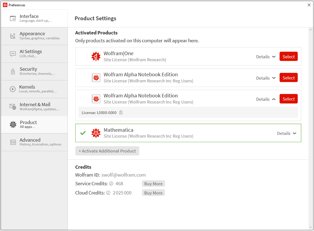 By using the appropriate Select button, Wolfram can be switched over to different licenses/products. If one of these buttons is selected, there will be a pop-up window warning that going through with this switch will close all open notebooks (you will be given a chance to save any with unsaved changes in them).