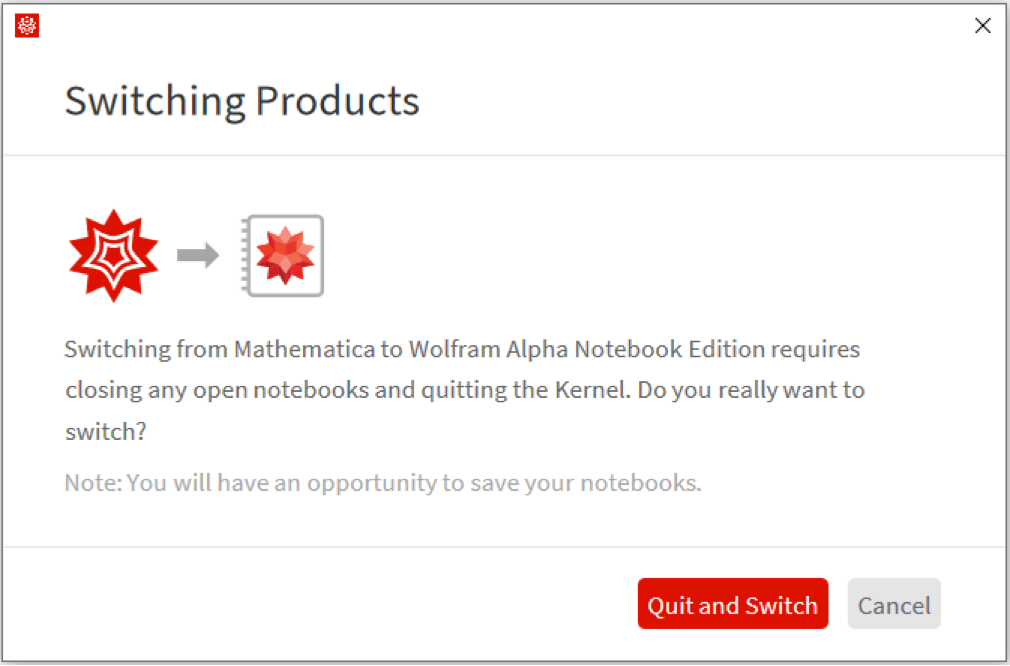 Selecting Quit and Switch will then close all open notebooks and quit the kernel. You will be sent to the Welcome Screen for the selected product/license.