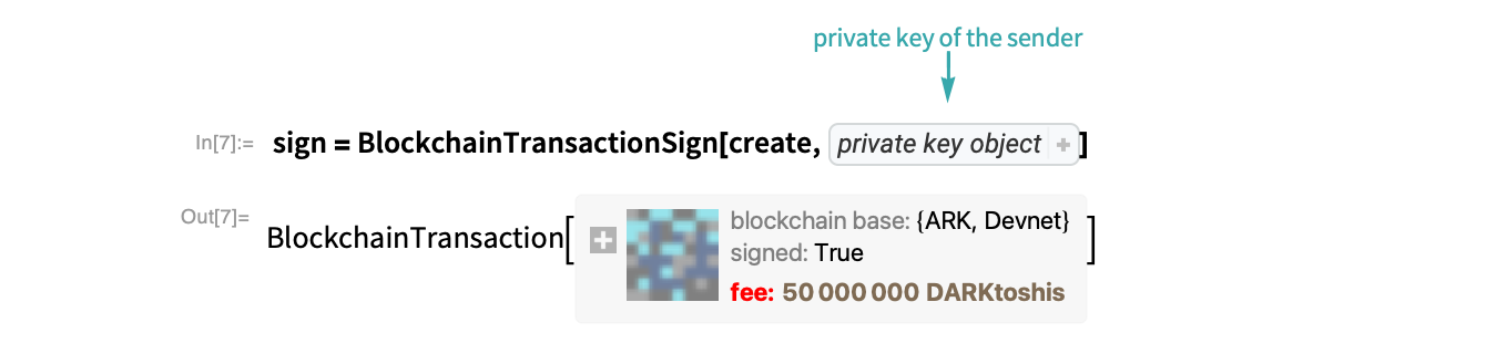 Use BlockchainTransactionSign to sign the transaction with the private key: