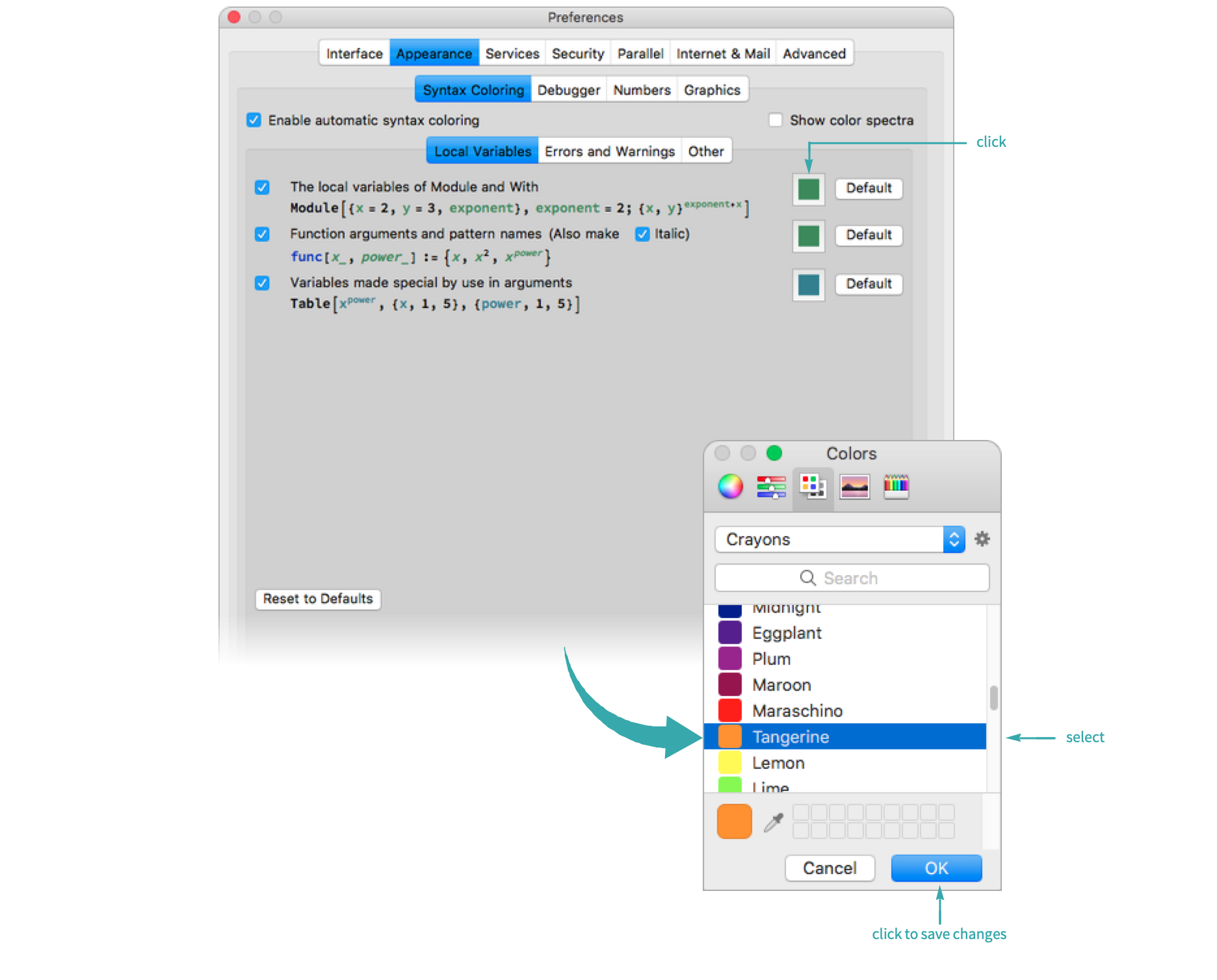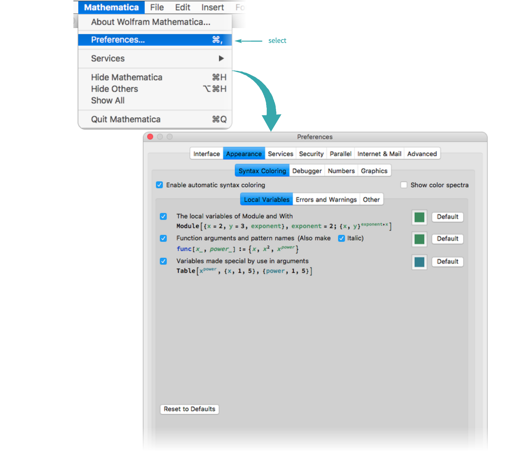In Appearance ▶ Syntax Coloring ▶ Local Variables, change the color of the local variables of Module and With using the color palette: