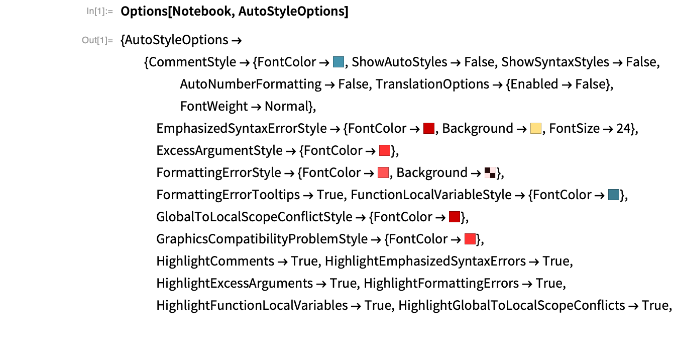 Use Options to examine the current values of all AutoStyleOptions that are available to change: