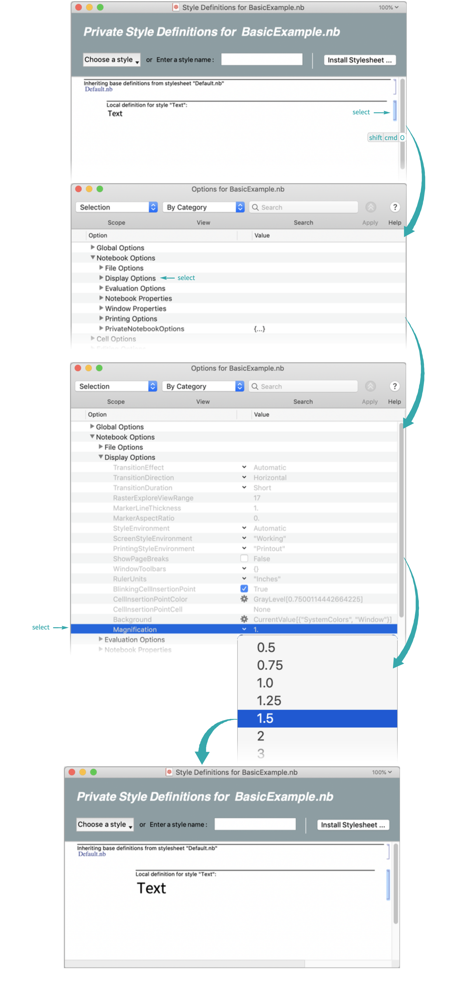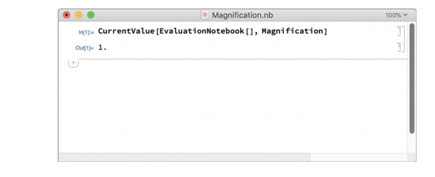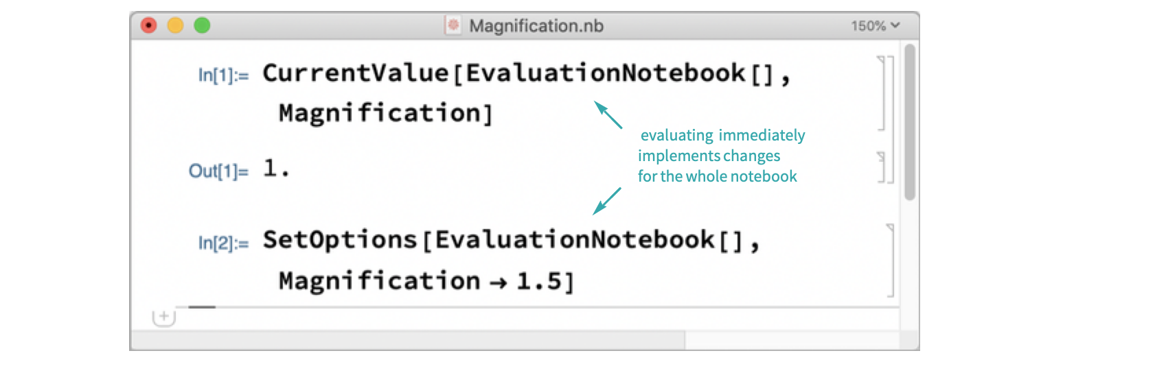 ) to open the Option Inspector. Select Notebook Options ▶ Display Options ▶ Magnification to change the magnification of the notebook to 150%: