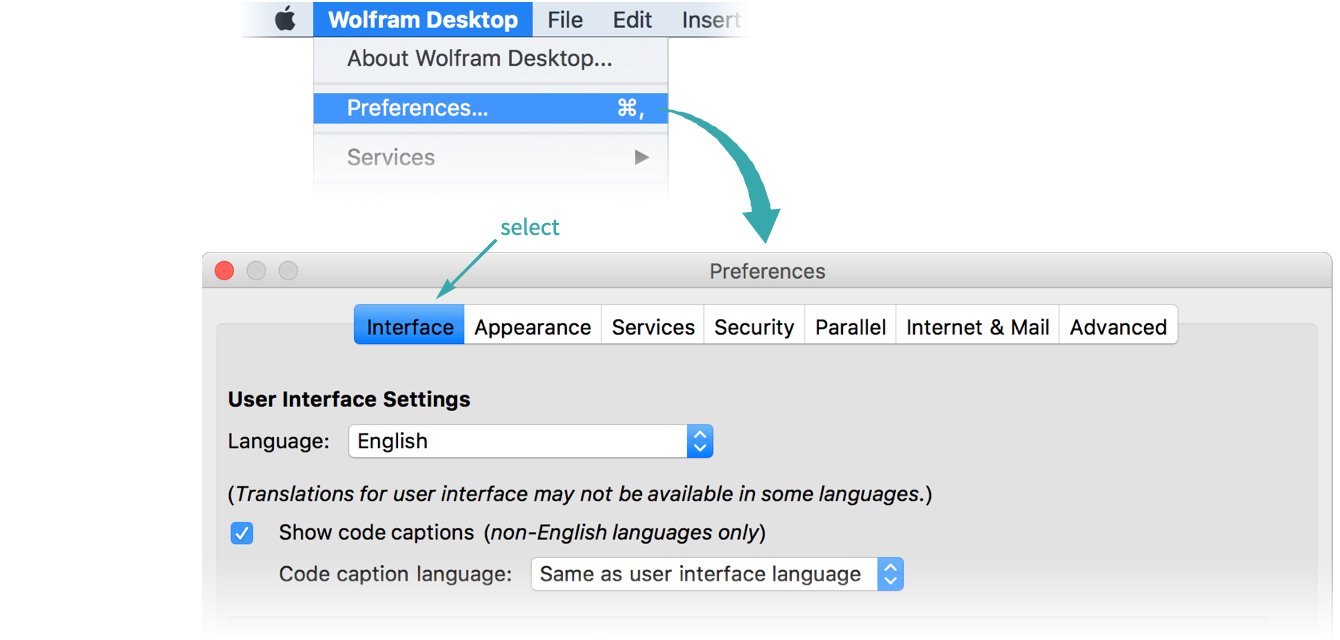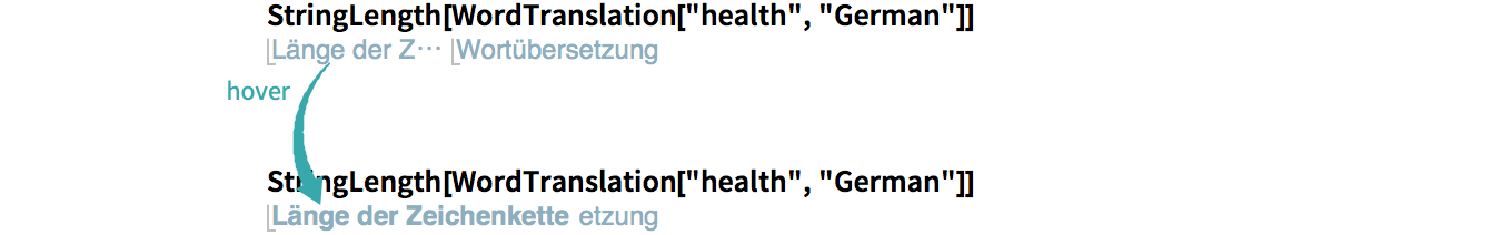With code captions turned on, Wolfram Language function names are annotated with their translations. Hover over a truncated name to see the name in full: