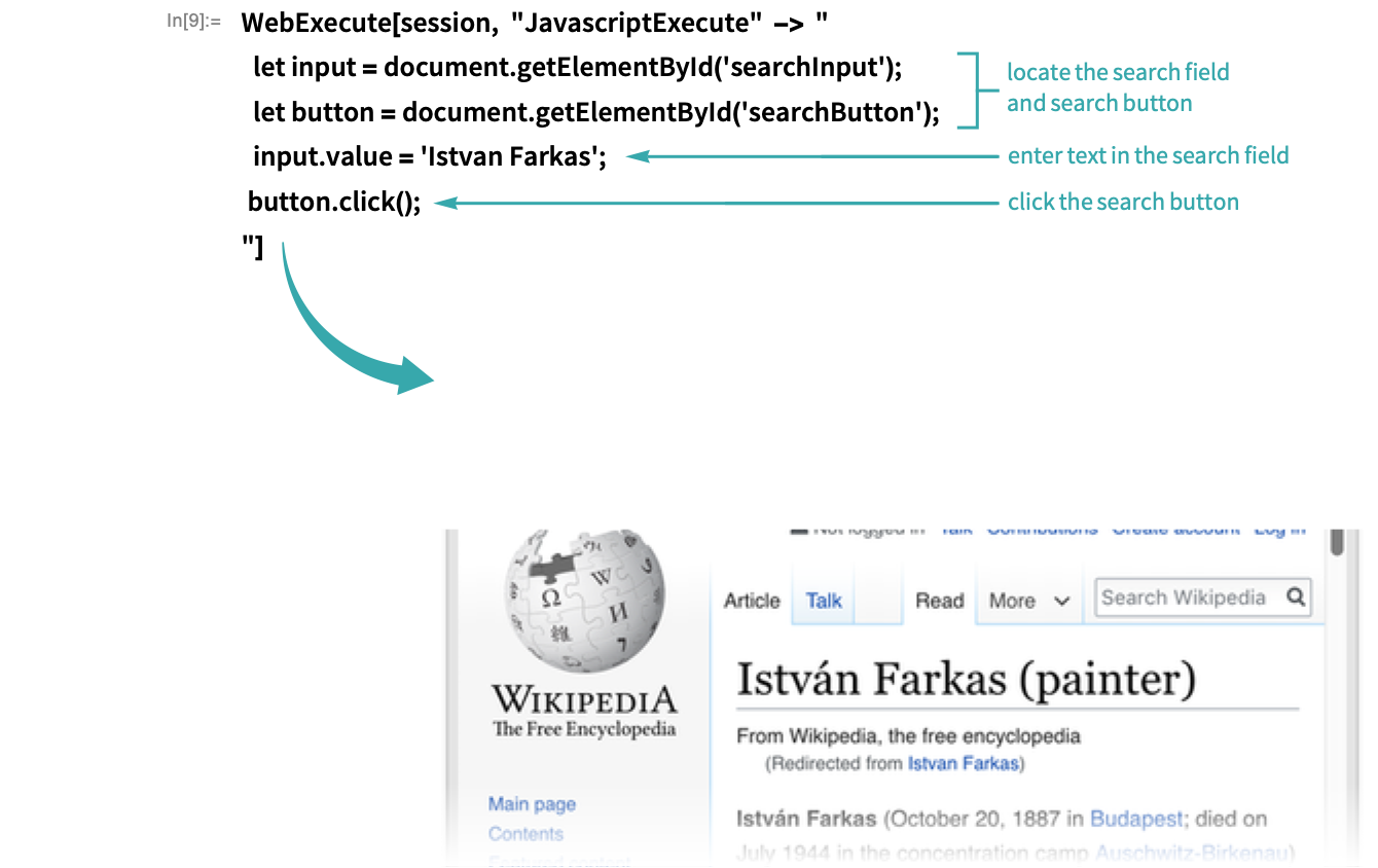 Pass a block of JavaScript code as a string to WebExecute, and the web driver will execute that code on the live page: